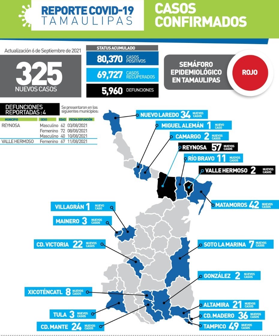 CD VICTORIA, TAMAULIPAS, 6 DE SEPTIEMBRE DE 2021.- Tamaulipas sumó este lunes 325 nuevos casos de COVID-19 a su conteo oficial, informó la secretaria de Salud, Gloria Molina Gamboa luego de señalar que el riesgo de contagio sigue siendo elevado y que las medidas de prevención representan la forma más efectiva de cortar la cadena de transmisión del virus.