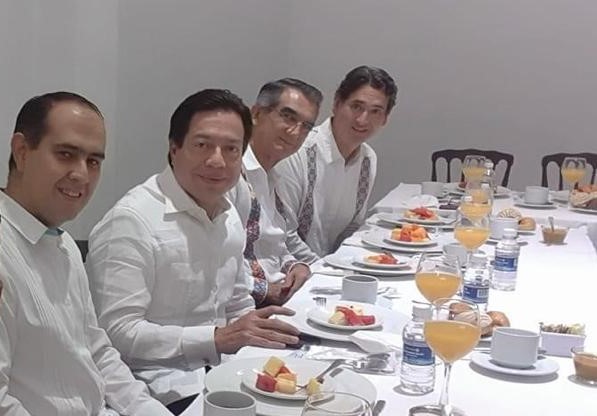 Mario Delgado Carrillo, dirigente nacional de MORENA, acudió a Ciudad Victoria al informe del Senador Américo Villarreal Anaya, con quien comparte desayuno previo al acto.