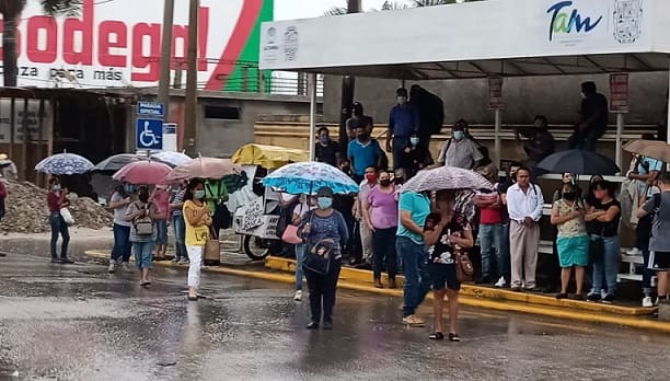 TAMPICO, TAMAULIPAS, 30 DE SEPTIEMBRE DE 2021.- Un ochenta por ciento del transporte público se paralizó al menos dos horas durante la mañana de este jueves a causa de la lluvia que se registró en la zona, situación que dejó varados a miles de usuarios de este servicio.