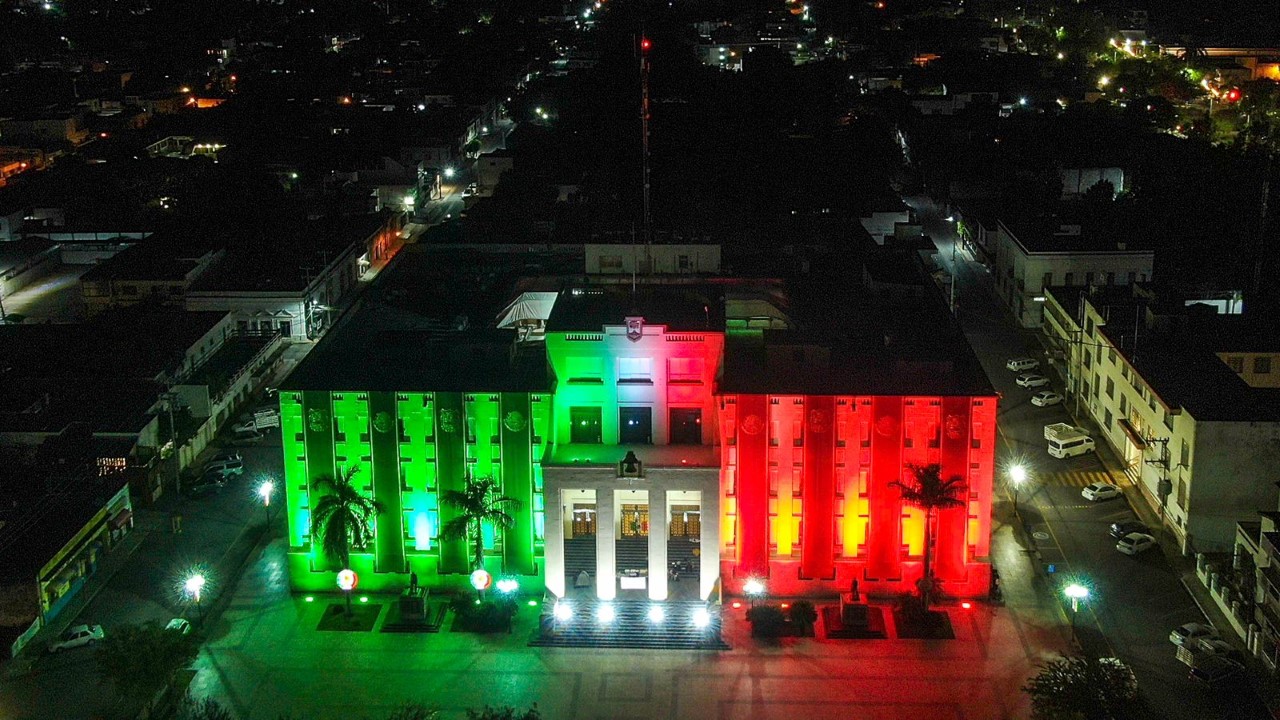 CD. VICTORIA, 2 DE SEPTIEMBRE DE 2021.- La administración estatal de origen panista en Tamaulipas, que preside Francisco García, en el arranque del mes patrio, septiembre, se puso la camiseta tricolor e iluminó de verde, blanco y rojo el Palacio de Gobierno y otras instituciones como el DIF Estatal.