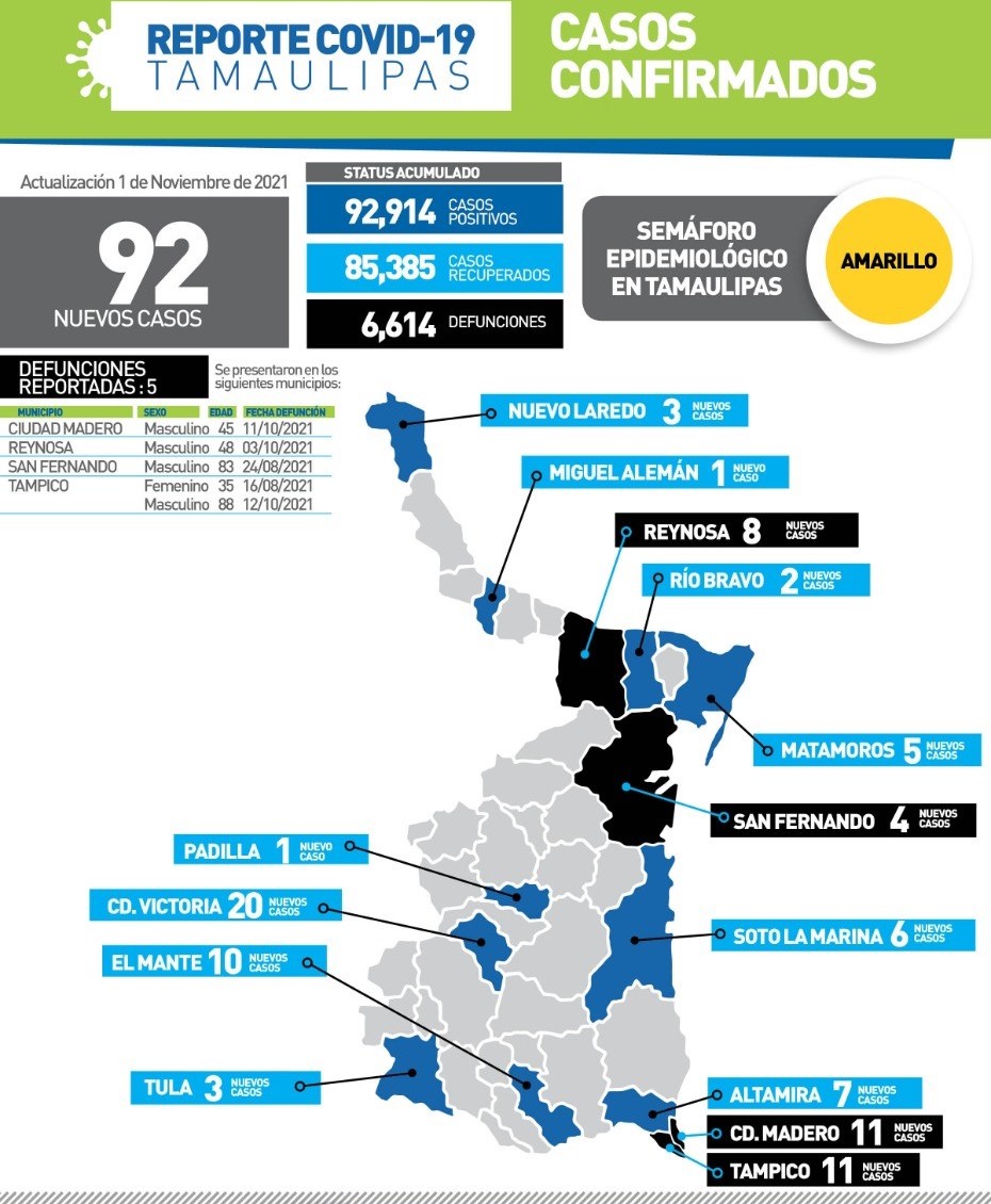 De los 5 fallecimientos se trata de una mujer de 35 años en Tampico; un hombre de 45 en Madero; un hombre de 48 en Reynosa; un hombre de 83 en San Fernando; y un hombre de 88 en Tampico.