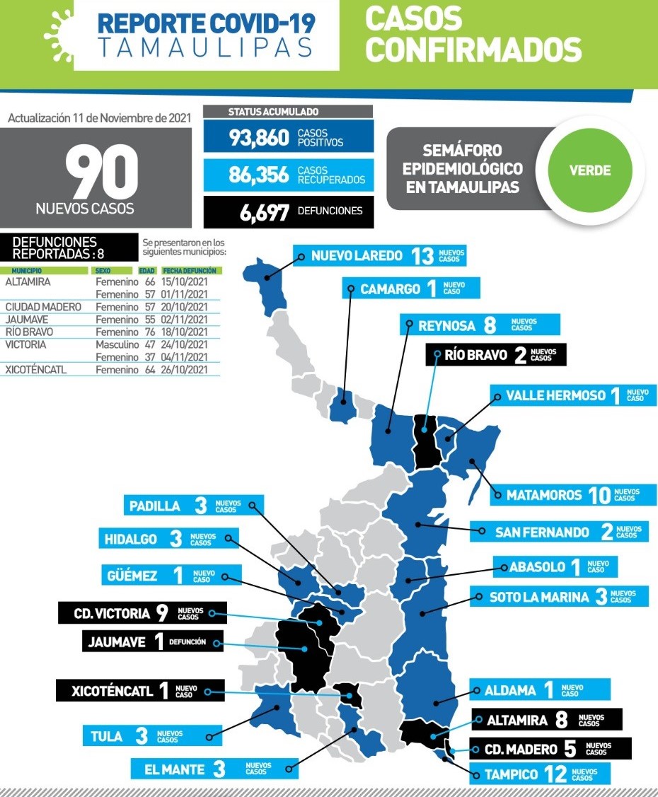 Entre los decesos por Covid dos corresponden a Victoria, una mujer de 37 años y un hombre de 47; así como una mujer de 55 años en Jaumave, entre los más jóvenes,