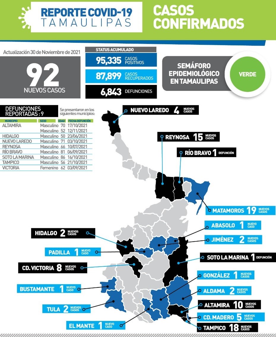 Cd. Victoria, Tamaulipas, 30 de noviembre de 2021.- En su reporte diario sobre el estado de la