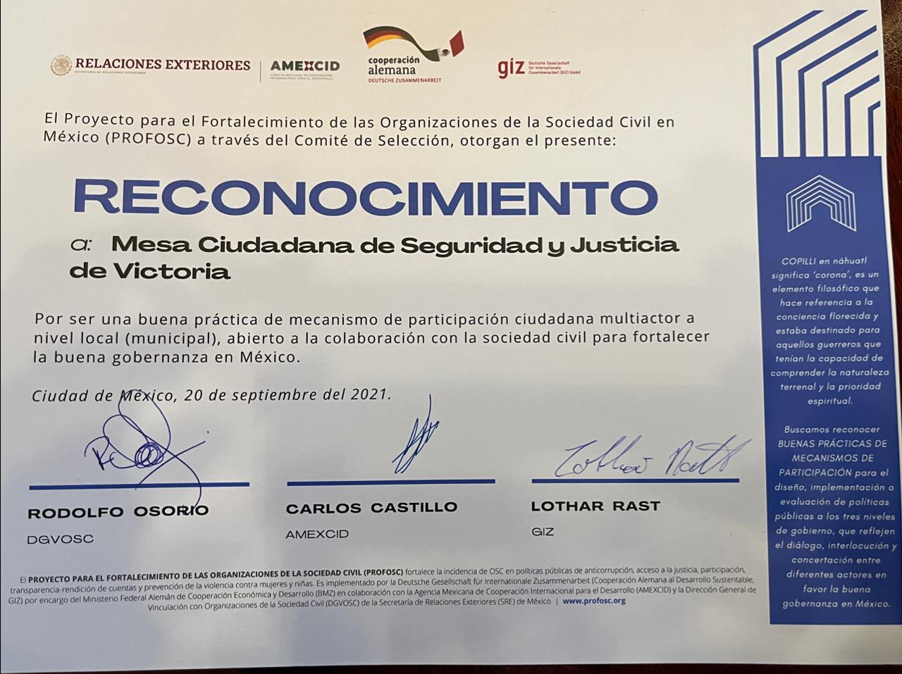 Recibe Mesa de Seguridad y Justicia de Victoria Premio Copilli de México y Alemania