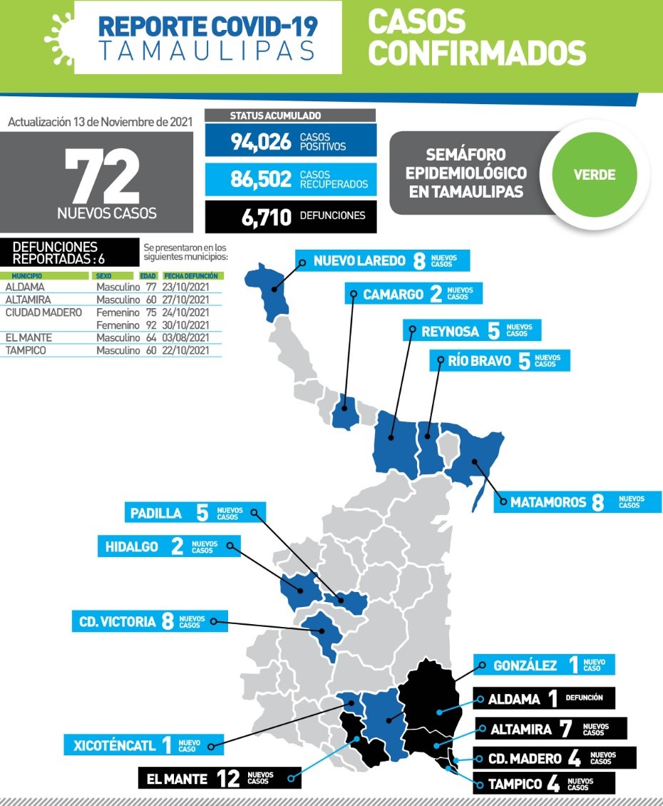 Seis muertos más por Covid en Tamaulipas y 72 nuevos contagios