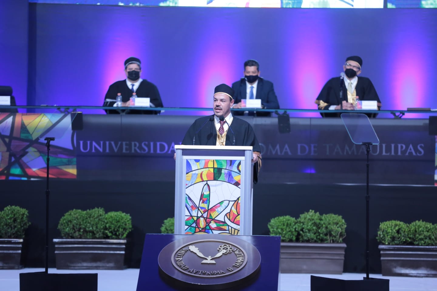CD. VICTORIA, TAMAULIPAS, 15 DE DICIEMBRE DE 2021.- Con la presencia del Gobernador Francisco García Cabeza de Vaca como invitado de honor, se llevó a cabo la ceremonia del IV Informe Rectoral del Ing. José Andrés Suárez Fernández y la Toma de Protesta del C. P. Guillermo Mendoza Cavazos como Rector de la Universidad Autónoma de Tamaulipas (UAT) para el período 2022-2025.