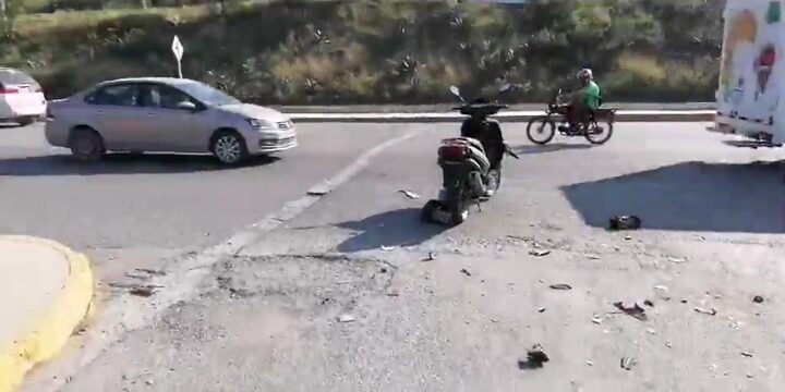 Se reporta un percance vehicular entre una motocicleta y un automóvil dejando como saldo un lesionado, afortunadamente el motociclista tenia puesto su casco, por lo cual, sufrió heridas leves, pero si con una gran contusión por el golpe.