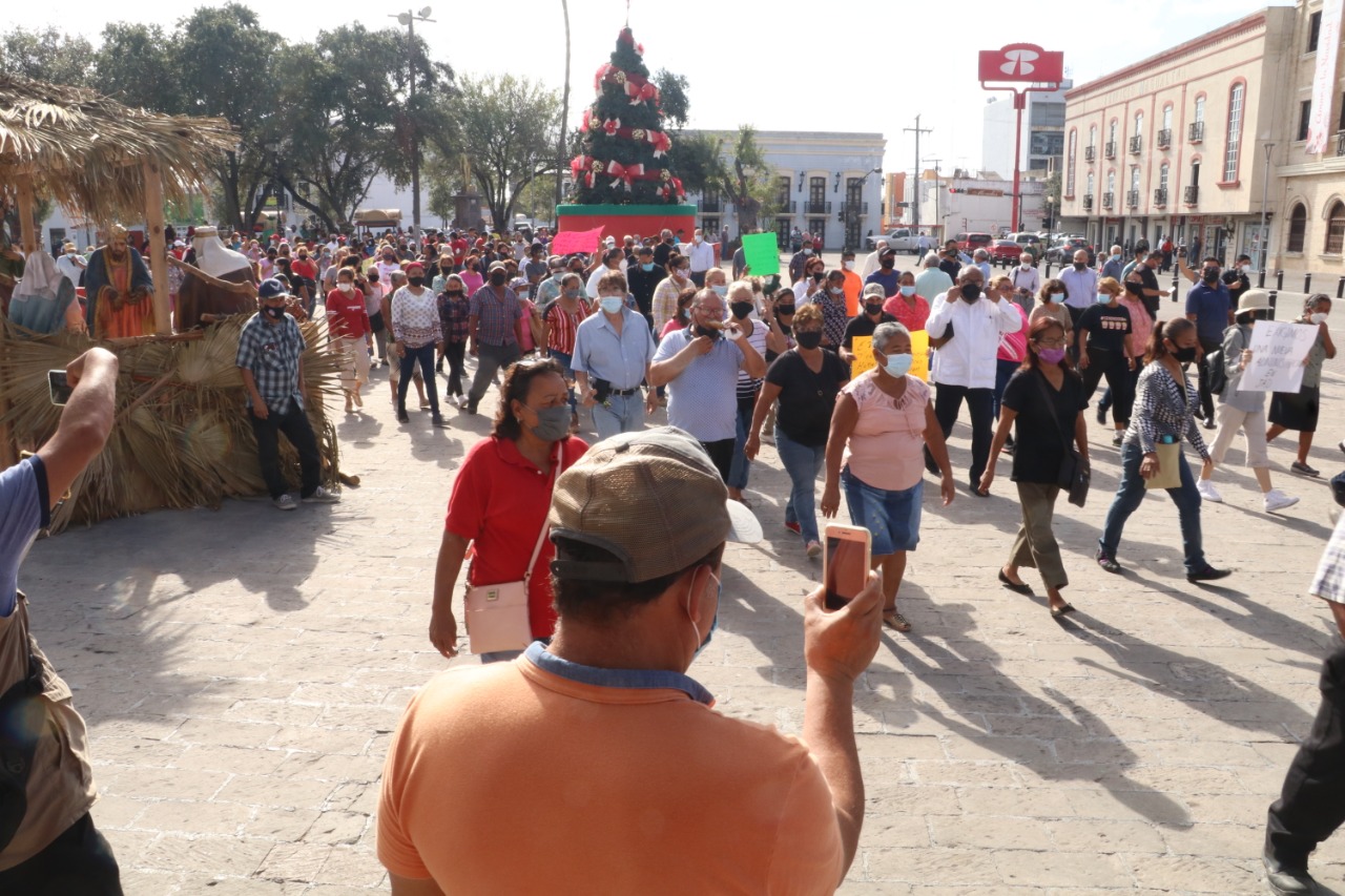 MATAMOROS, TAMAULIPAS, 16 DE DICIEMBRE DE 2021.-Acompañados por cientos de matamorenses, integrantes del Cabildo encabezaron este jueves por la mañana en la manifestación pacífica para pedir la destitución inmediata del nuevo gerente de la Junta de Aguas y Drenaje de Matamoros, por no cumplir con el perfil para dirigir la paramunicipal, además de representar intereses de tinte político.