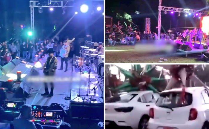 A través de su cuenta de Twitter @_fannymartinez, la periodista mostró imágenes de automóviles nuevos, adornados con grandes moños de regalo, estacionados a un costado de un escenario donde habrían tocaron las bandas Los Nuevos Rebeldes y Revolver Cannabis.