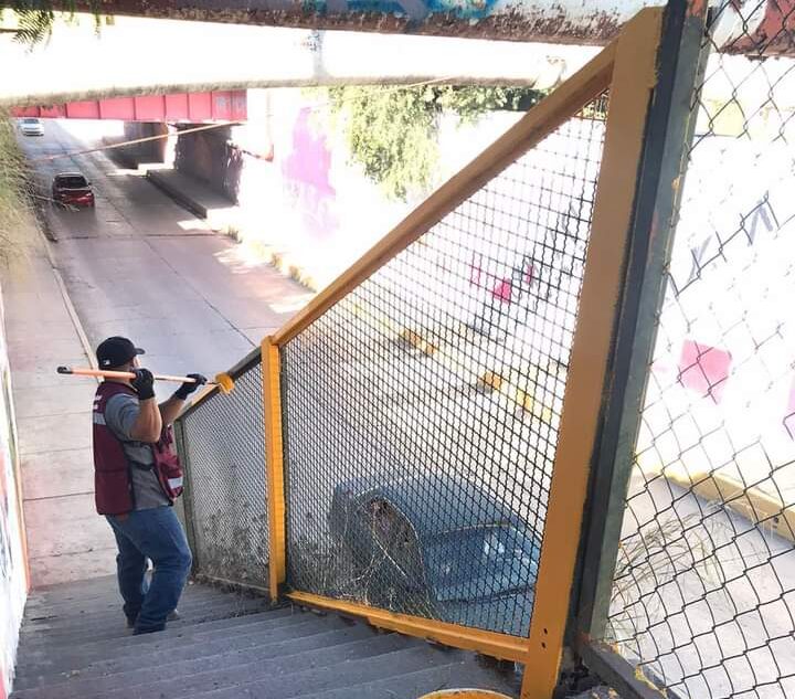 Las obras de construcción, ubicación y rastreo en la ciudad, rehabilitación, etcétera, continua en circulación, en esta ocasión, el alcalde Lalo Gattás junto con Obras Públicas se han dado a la tarea de dar un mantenimiento a los barandales y escaleras en el paso a desnivel del 22 Juárez justo debajo de las vías viejas del tren.