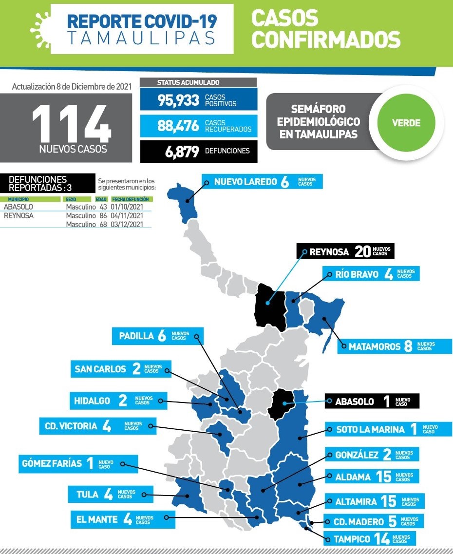 Muere de Covid hombre de 43 años en Abasolo; 114 nuevos contagios en Tamaulipas