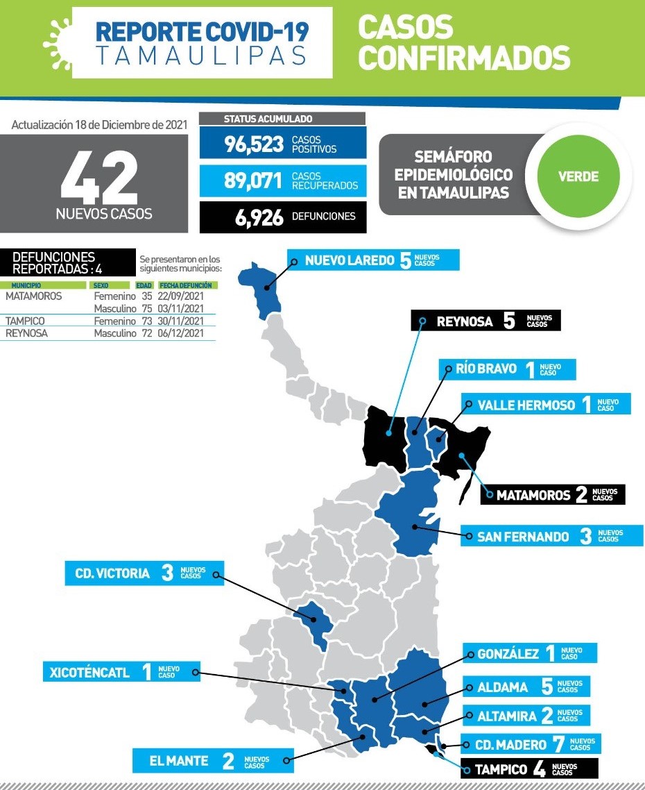 pandemia, la secretaria de Salud de Tamaulipas, Gloria Molina Gamboa confirmó 42 nuevos casos de COVID-19 y 4 fallecimientos, entre ellos una mujer de 35 años en Matamoros.
