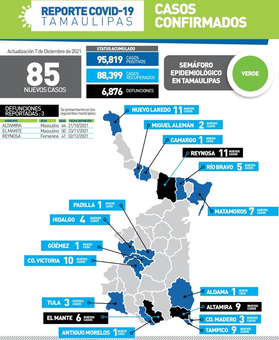 confirmó 85 nuevos casos y 3 fallecimientos asociados a complicaciones graves, entre ellas una mujer de 41 años en Reynosa. por lo que pidió no bajar la guardia y ser ciudadanos socialmente responsables