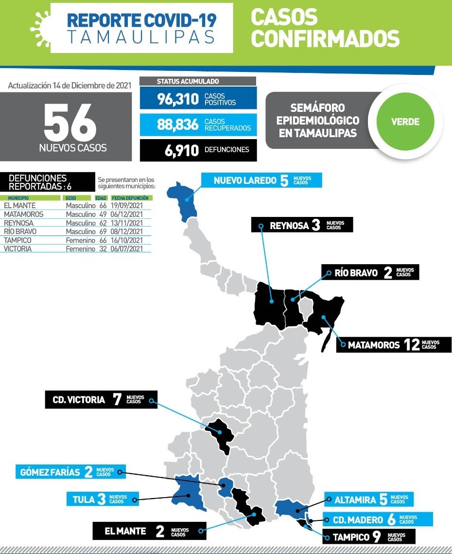 Al presentar el balance oficial de la pandemia, Molina Gamboa confirmó 56 nuevos casos y 6 defunciones asociadas a complicaciones graves, entre ellas una mujer de 32 años en Ciudad Victoria.