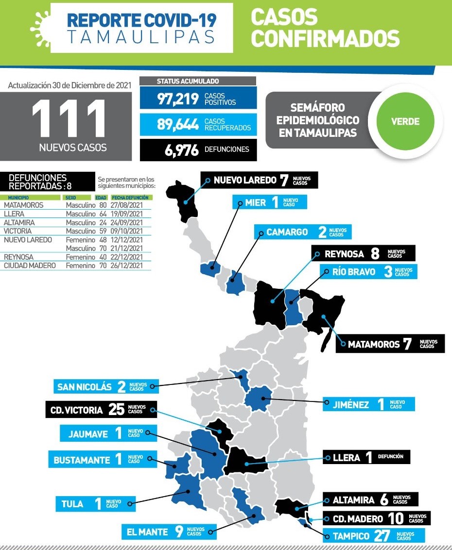 Al presentar el balance oficial de la pandemia, Molina Gamboa confirmó 111 contagios y 8 victimas mortales, entre ellos un varón de 24 años en Altamira y una mujer de 40 años en Reynosa.