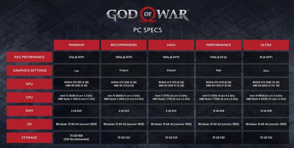 Por su puesto con la llegada del titulo a PC, el estudio creador de la franquicia, Santa Monica Studio, no ha querido dejar con la duda a los fanáticos del juego y ha decidió revelar las especificaciones para poder jugarlo sin detalles en la plataforma de PC.