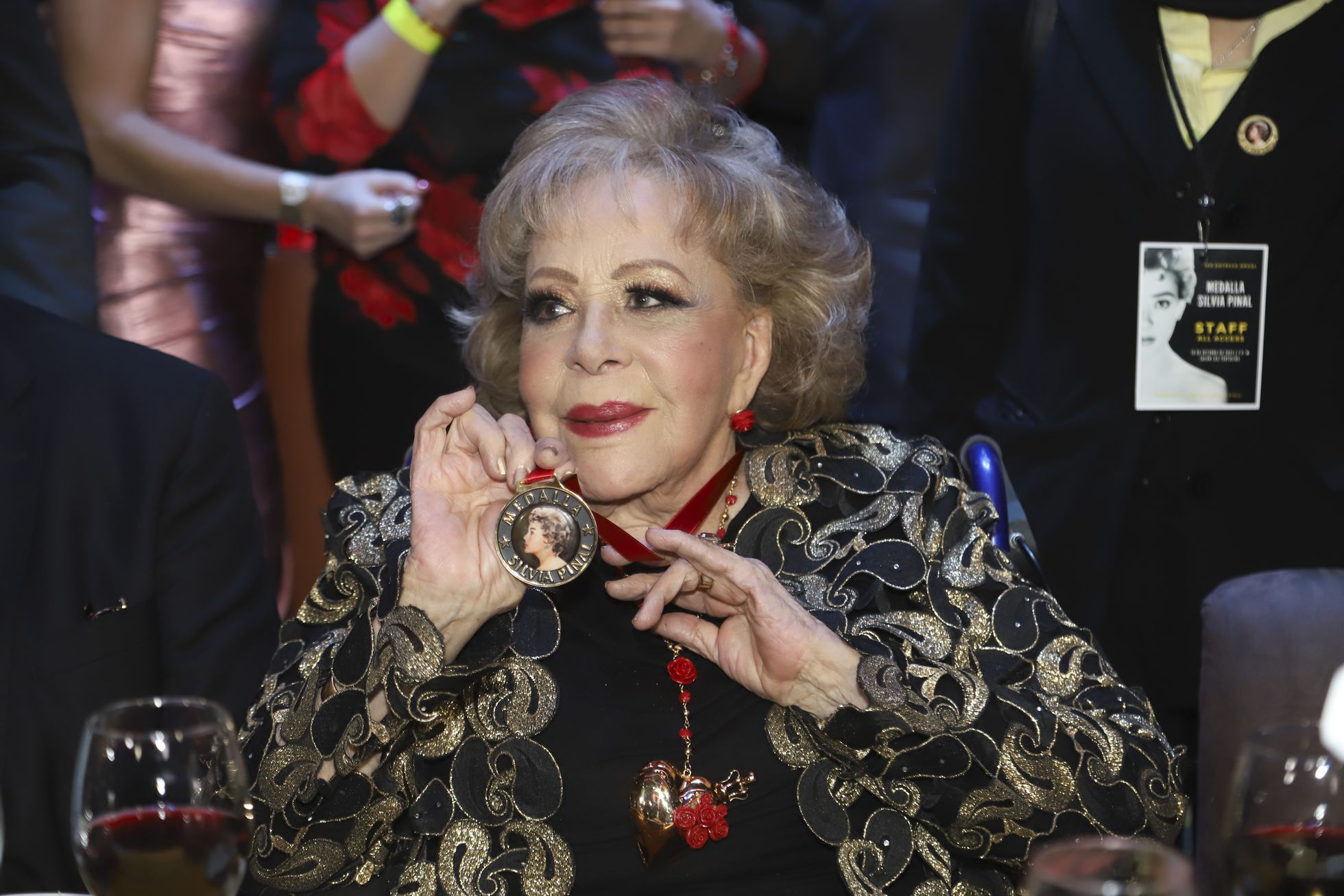 MEXICO CITY, MEXICO - OCTOBER 18: Actress Silvia Pinal shows her medal during recognition of her own artistic career, at Salón Las Tertulias on October 18, 2021 in Mexico City, Mexico. (Photo by Medios y Media/Getty Images)