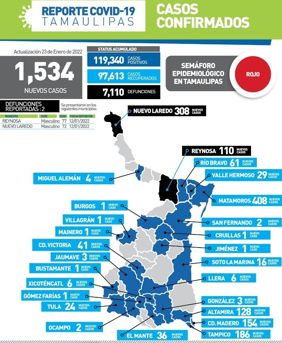 Los municipios con mayor número de contagios son Matamoros con 408; Nuevo Laredo con 308; Tampico con 186; Madero con 154; Altamira con 128; Reynosa con 110; Río Bravo con 61; Cd. Victoria con 41; El Mante con 36; Valle Hermoso con 29 y Tula con 24, entre otros.