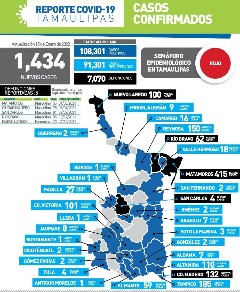 Cd. Victoria, Tamaulipas, 15 de enero de 2022.- Tamaulipas cerró la jornada de este sábado con 1434 positivos a COVID-19 y 5 fallecimientos asociados a complicaciones graves, informó desde esta ciudad capital la secretaria de Salud, Gloria Molina Gamboa tras convocar a la población a atender las medidas emitidas por el Gobierno de