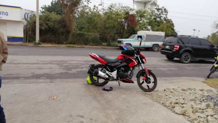 CD. VICTORIA, TAMAULIPAS, 23 DE ENERO DE 2022.-La falta de precaución por parte del conductor de una motocicleta fue la causa para que resultara lesionado al igual que su acompañante tras estrellarse contra un auto.
