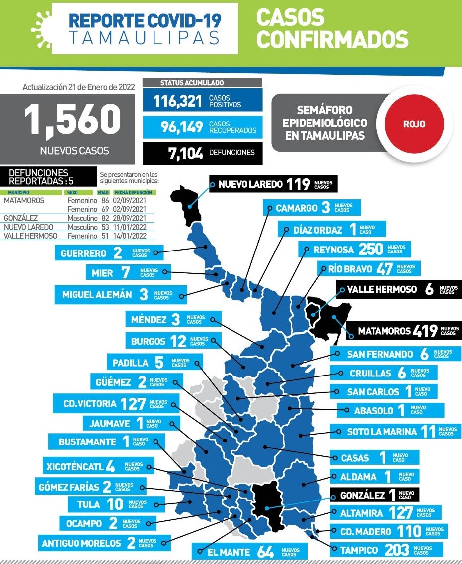 CD. VICTORIA, TAMAULIPAS, 21 DE ENERO DE 2022.- Tamaulipas cerró la jornada de este viernes con 1560 nuevos casos de COVID-19 y 5 fallecimientos asociados a complicaciones graves por el virus, informó desde esta ciudad capital la secretaria de Salud, Gloria Molina Gamboa quien insistió en su llamado a completar el esquema de vacunación y reforzar las medidas preventivas.