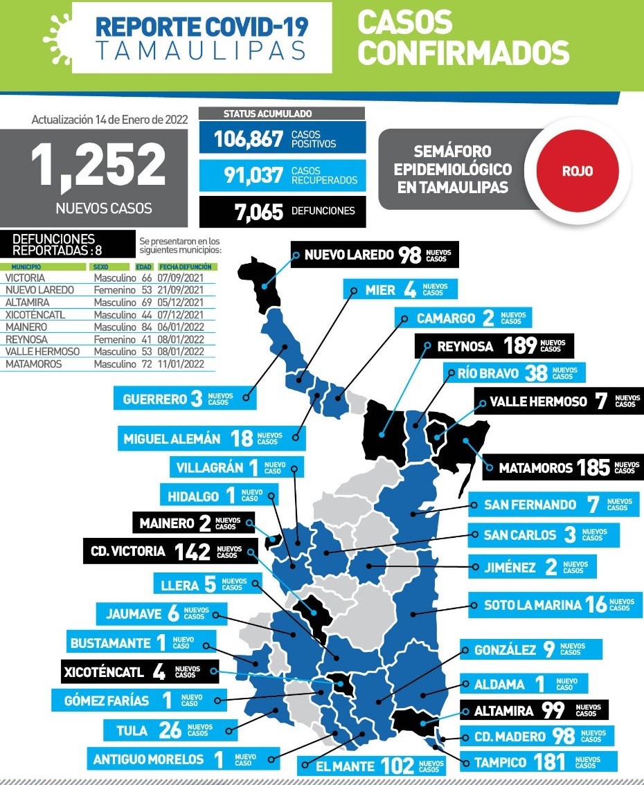 Ciudad Victoria, Tamaulipas (14 de enero de 2022).- Luego de registrarse 1,252 contagios de COVID-19 durante la jornada de este viernes, la secretaria de Salud de Tamaulipas, Gloria Molina Gamboa advirtió que sólo será posible cortar la cadena de transmisión del virus y disminuir casos “si nos cuidamos entre todos y aportamos la parte que nos corresponde”.