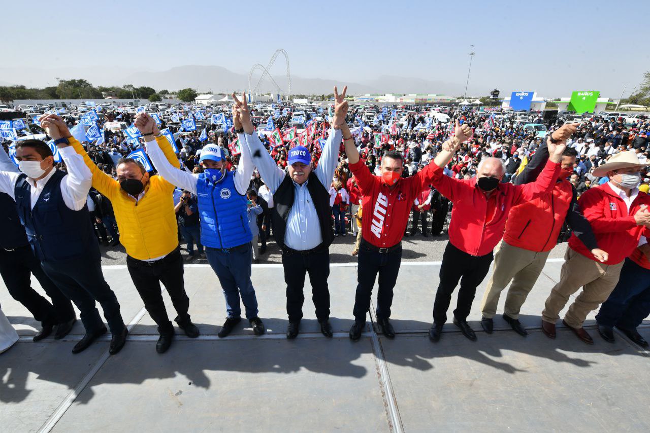 por los partidos Acción Nacional (PAN), Revolucionario Institucional (PRI) y de la Revolución Democrática (PRD), junto con la sociedad civil, vamos a dejar claro el 5 de junio que la entidad seguirá con un gobierno cercano y comprometido con la gente, afirmó Alejandro Moreno, dirigente nacional del tricolor.