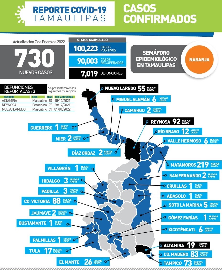 Con los datos de este viernes Tamaulipas supera ya los cien mil casos de contagios de Covid-19 en el curso de la pandemia, al alcanzar los 100 mil 223 casos, de los cuales se han recuperado 90 mil 003 y lamentablemente han fallecido 7 mil 019 tamaulipecos.