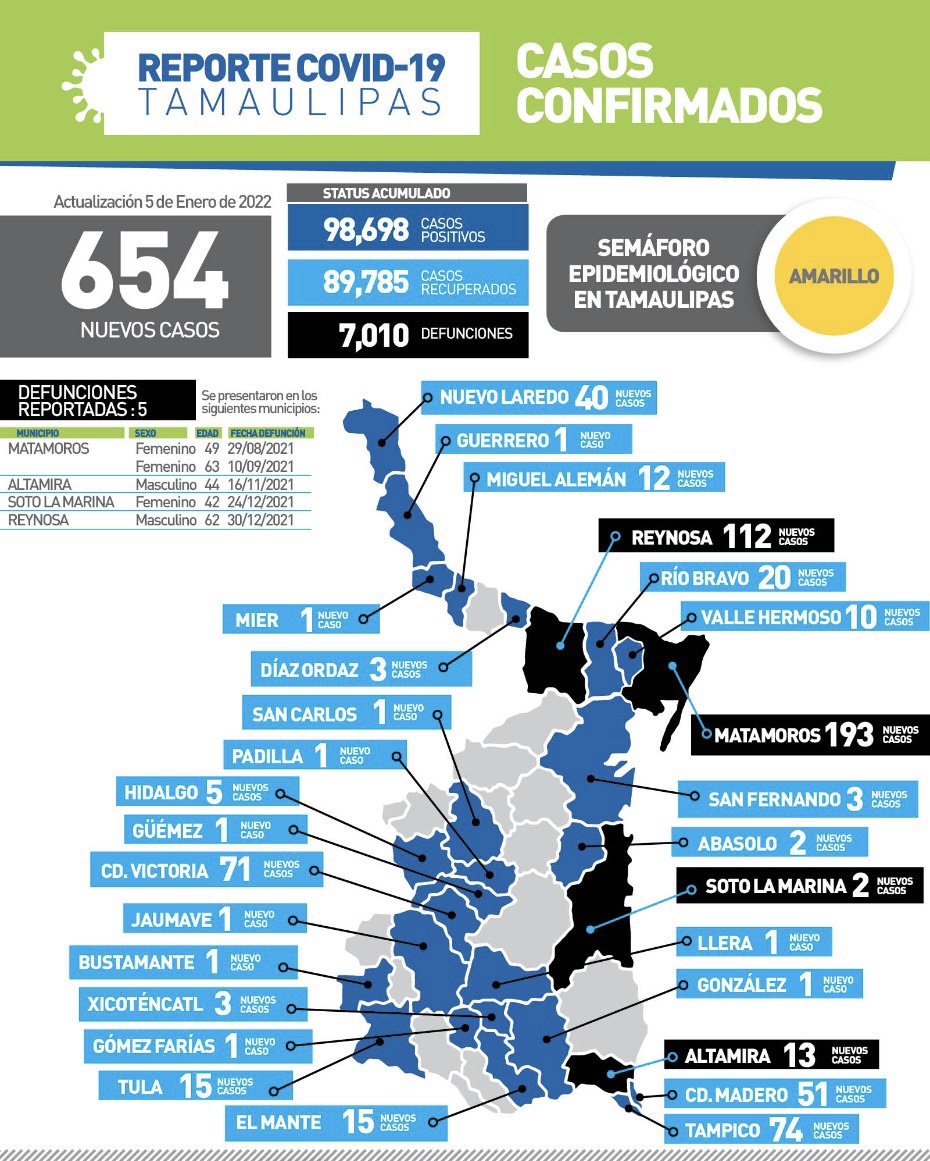 Ciudad Victoria, Tamaulipas (5 de enero de 2022).- La secretaria de Salud de Tamaulipas, Gloria Molina Gamboa advirtió hoy que los contagios de COVID-19 han registrado un incremento durante los últimos días y aunque a la fecha no han aumentado las hospitalizaciones ni las defunciones, urgió a la población a completar el esquema de vacunación y aplicarse la dosis de refuerzo para disminuir el riesgo de complicaciones graves.