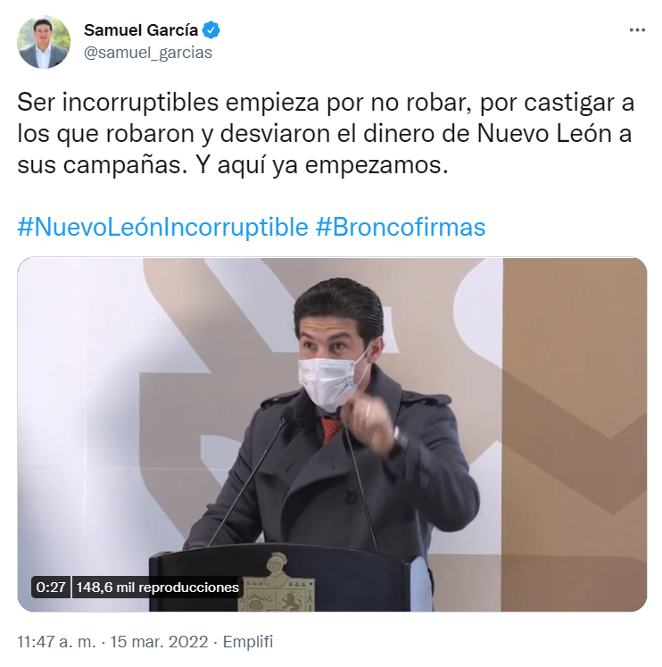 También a través de Twitter el Ejecutivo estatal Samuel García llevo a cabo, y publicó un comunicado en un video corto de 43 segundos acompañada del texto ‘’ser incorruptibles empieza por no robar, por castigar a quienes robaron y desviaron el dinero de Nuevo León a sus campañas. Y aquí ya empezamos’’