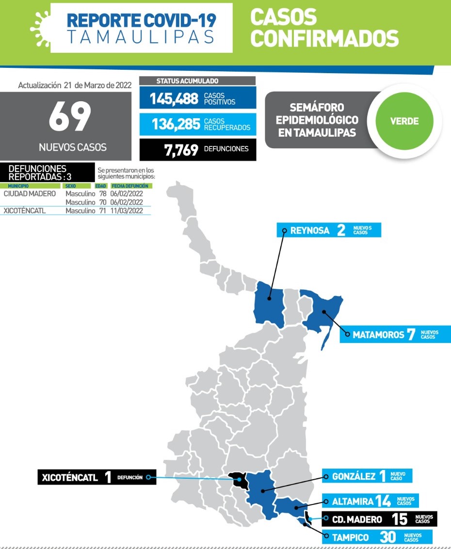 Ciudad Victoria, Tamaulipas, 21 de marzo de 2022.- Tamaulipas cerró la jornada de este lunes con 69