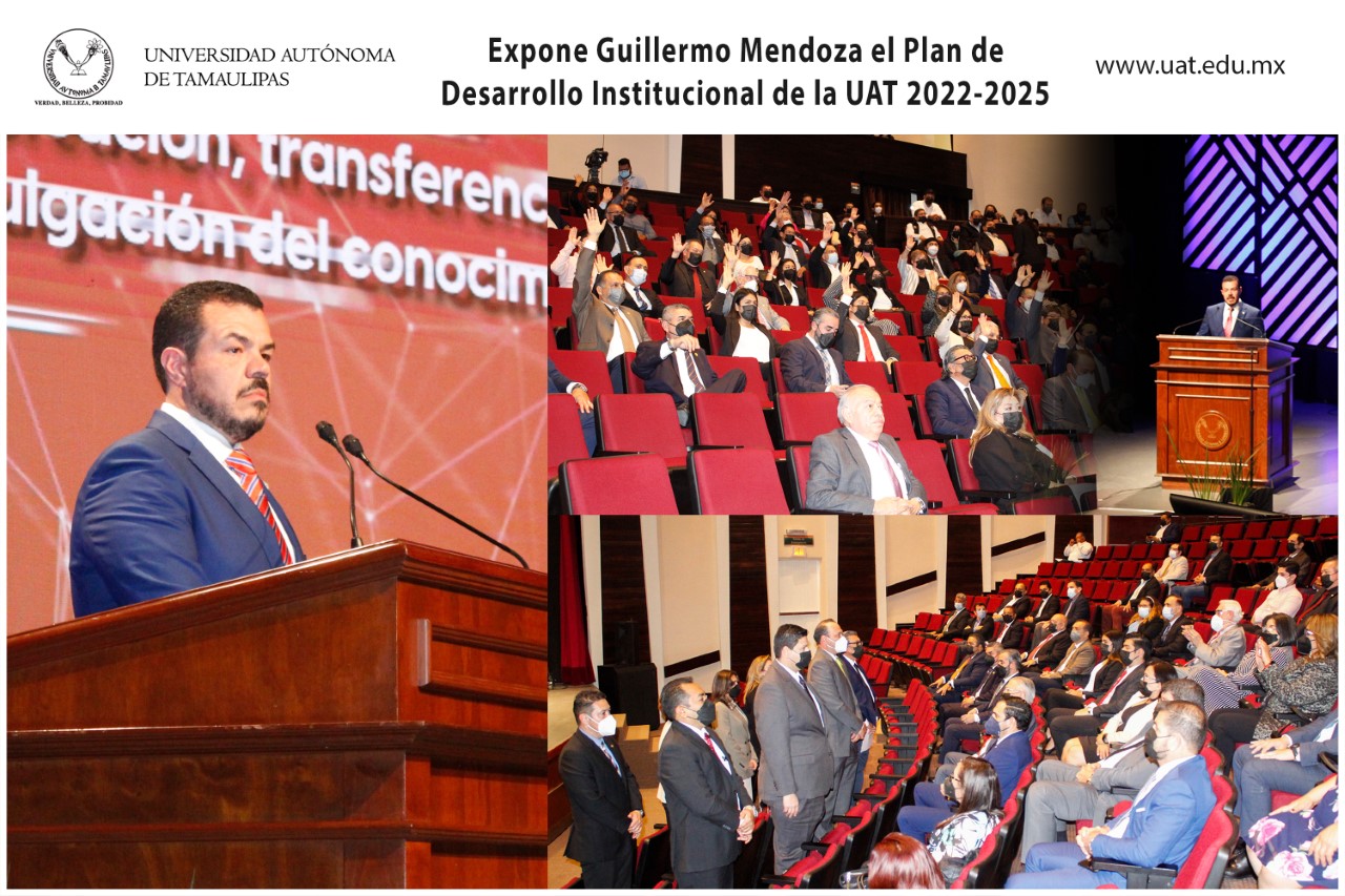 Tampico, Tamaulipas, 21 de marzo de 2022.- El C. P. Guillermo Mendoza Cavazos expuso el Plan de Desarrollo Institucional (PDI), en el que presenta los objetivos que enmarcan su proyecto de gestión al frente de la Universidad Autónoma de Tamaulipas (UAT) durante el período 2022-2025.