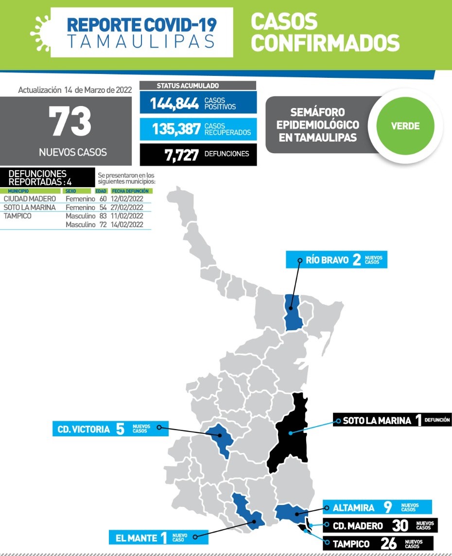 CIUDAD VICTORIA, TAMAULIPAS.- Tamaulipas registró 73 positivos a COVID-19 y 4 fallecimientos asociados a complicaciones graves por el virus, informó en su reporte de este lunes la Secretaría de Salud.
