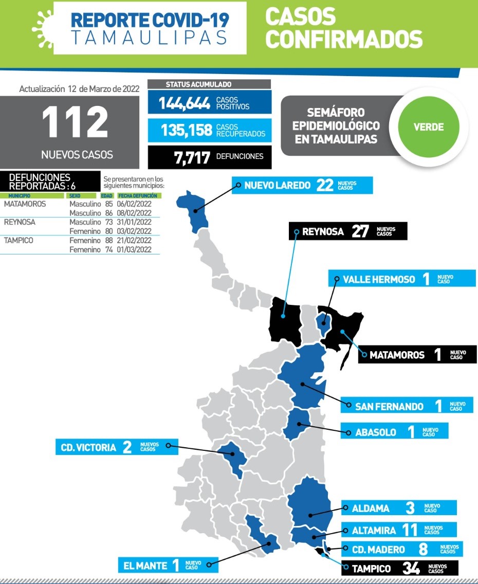Seis muertos más y 112 nuevos contagios de Covid en Tamaulipas