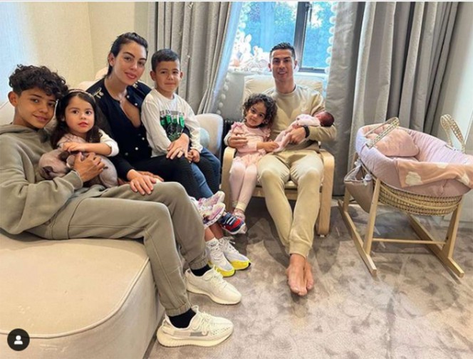 En la imagen, puede apreciarse a Cristiano sentado, con la recién nacida en brazos, y abrazando a la pequeña Eva. En otro sillón posa Georgina Rodríguez con Mateo sentado en las piernas y en primer plano está Cristiano Jr abrazando a su hermana Alana Martina.