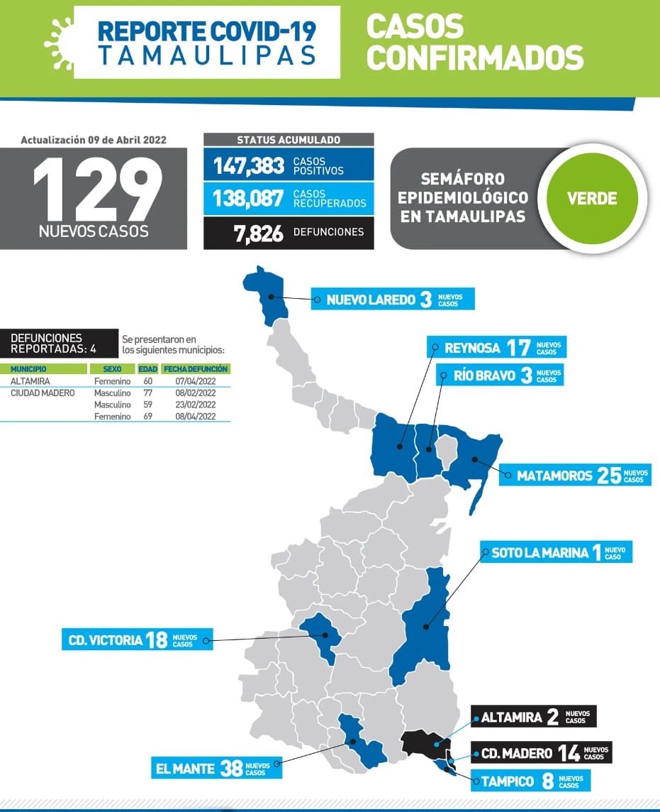 Ciudad Victoria, Tamaulipas, 9 de Abril de 2022.- La pandemia de COVID-19 sumó 129 nuevos casos y 4 fallecimientos asociados a complicaciones graves, informó en su reporte técnico diario la Secretaría de Salud de Tamaulipas.