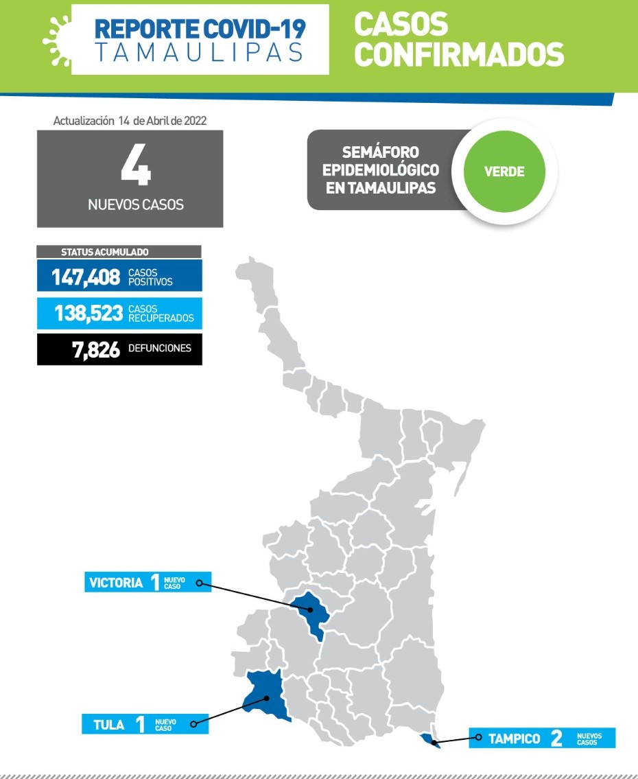 Reportan hoy 4 casos de Covid en Tamaulipas; piden mantener medidas preventivas