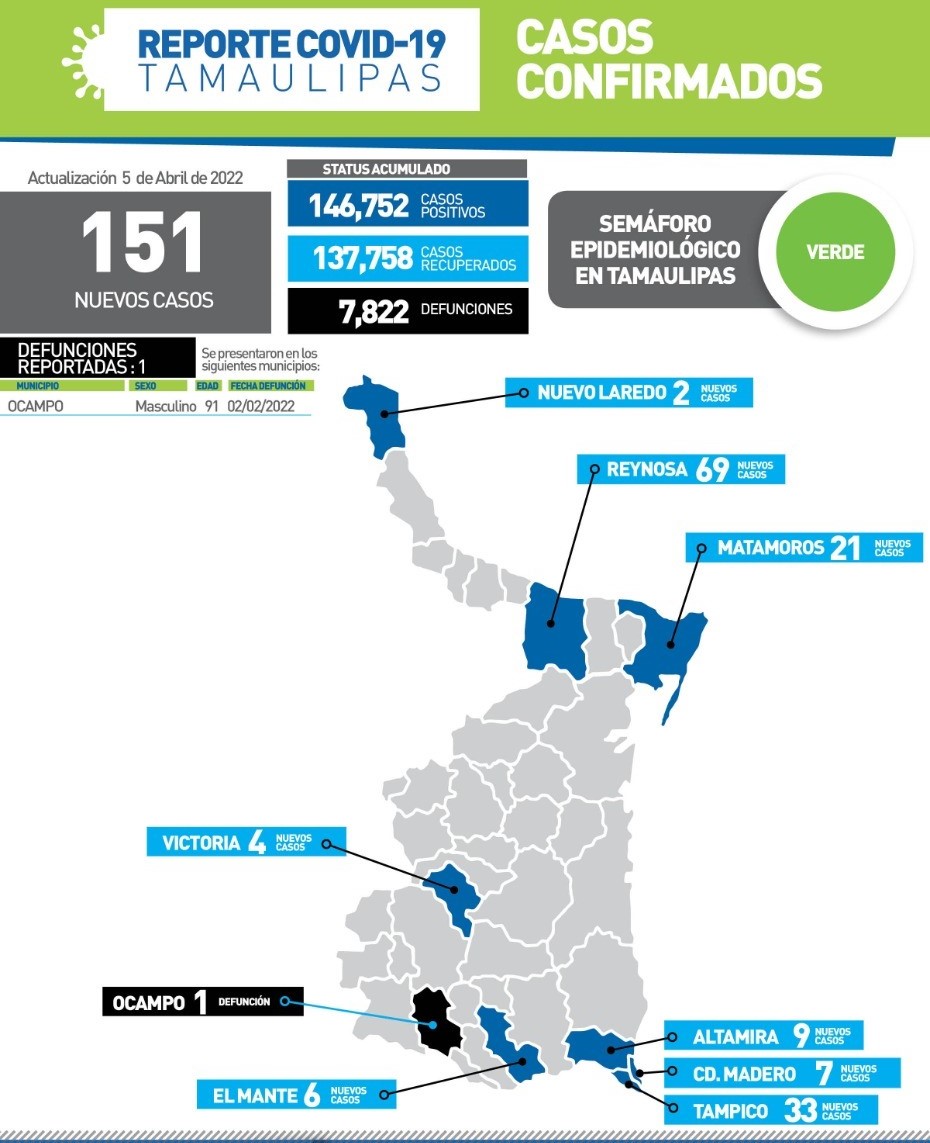 CD. VICTORIA, TAMAULIPAS, 5 DE ABRIL DE 2022.-.- Tamaulipas cerró la jornada de este martes con un