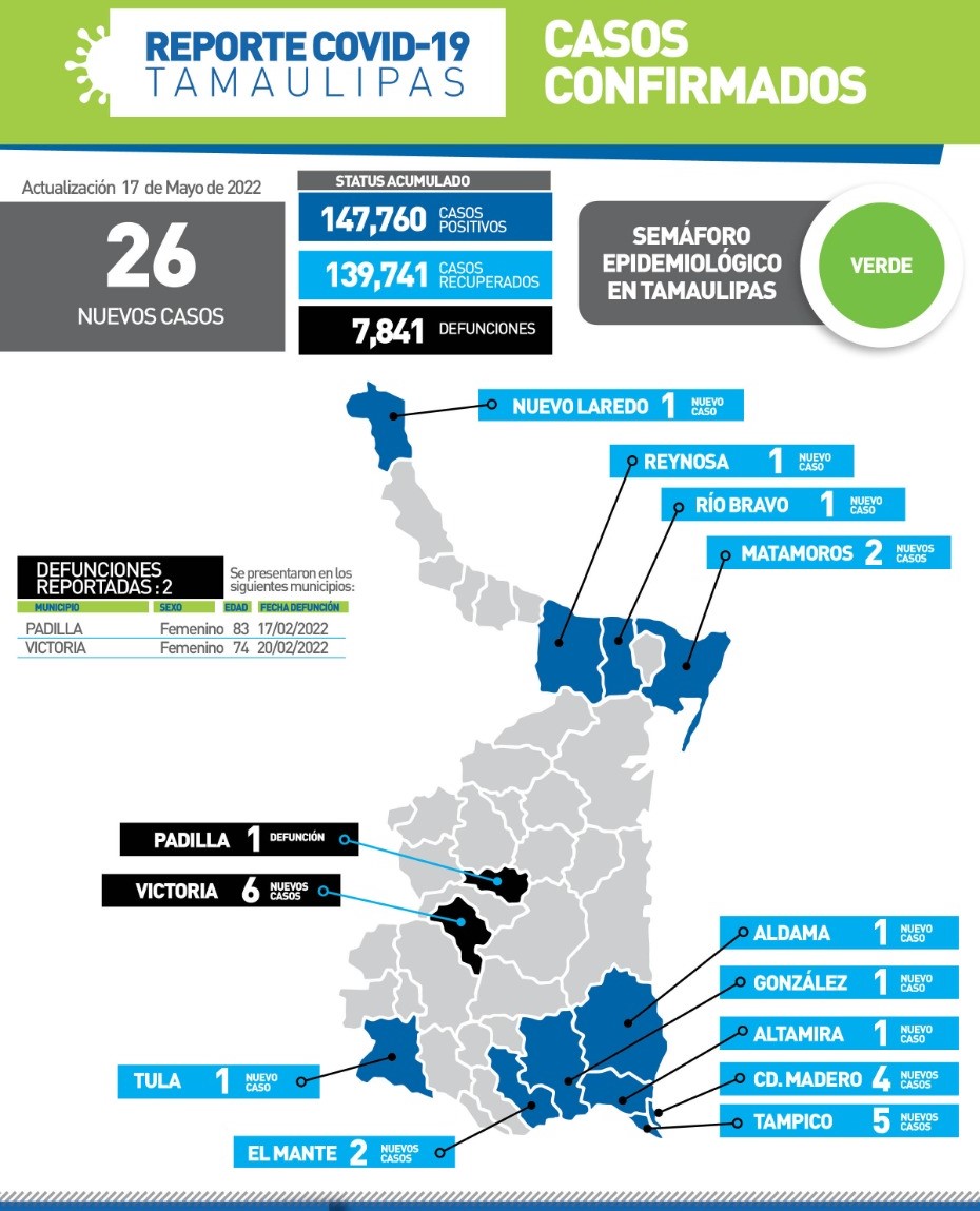 CD. VICTORIA, TAMAULIPAS, 17 de mayo de 2022.- Tras confirmar el fallecimiento de 2 pacientes por COVID-19 en Tamaulipas, la Secretaría de Salud pidió a la población completar el esquema de vacunación, aplicarse la dosis de refuerzo y mantener el control de enfermedades crónicas para disminuir el riesgo de hospitalizaciones y