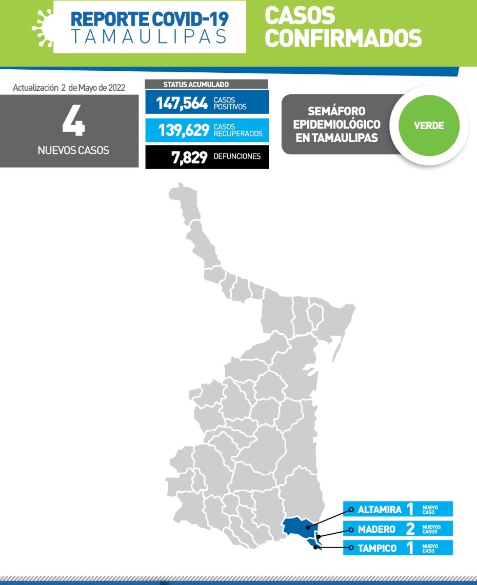 la pandemia, la Secretaría de Salud de Tamaulipas confirmó 4 nuevos casos y