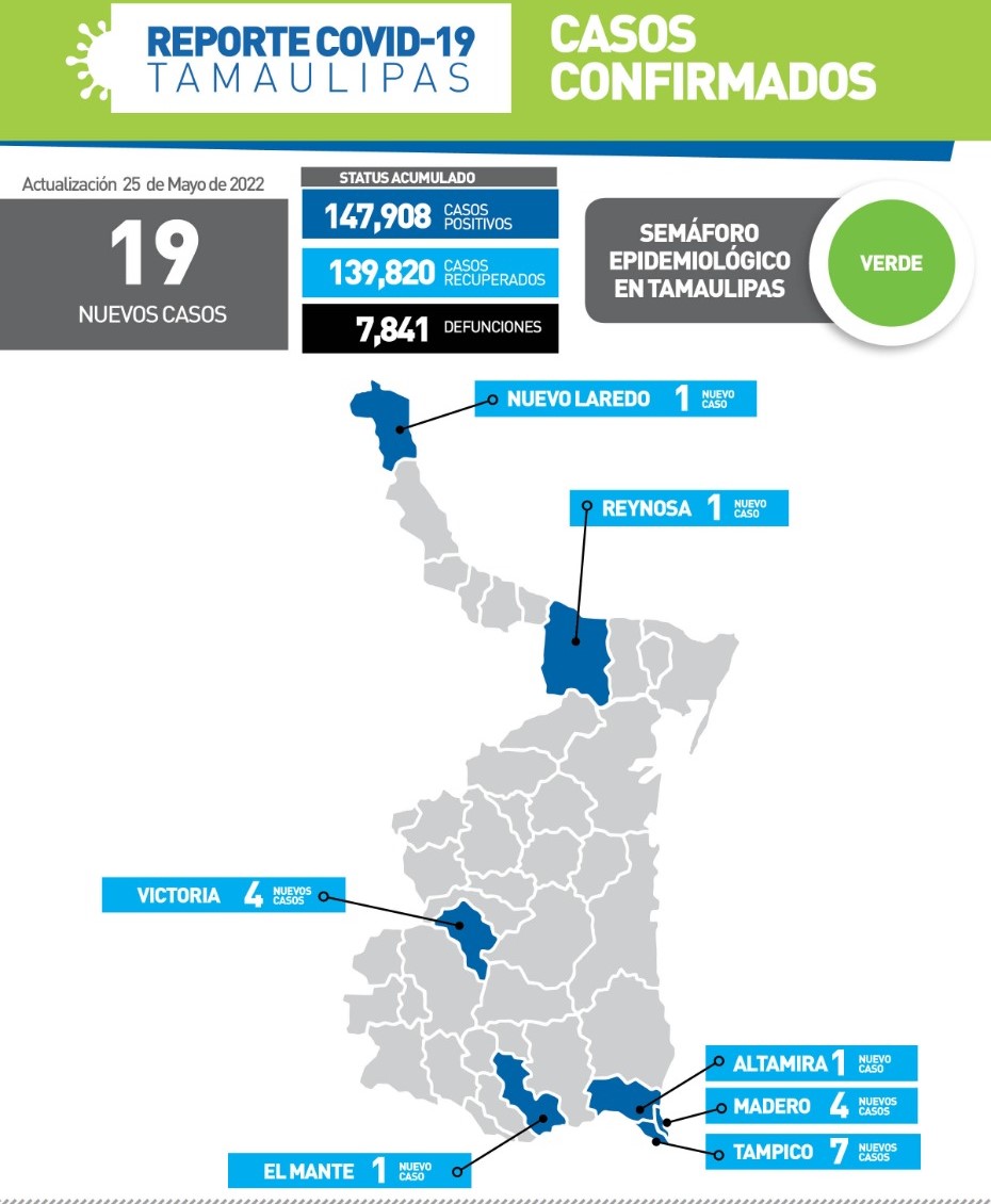 Sigue vivo Covid-19 en Tamaulipas; hoy 19 nuevos contagios en 7 municipios