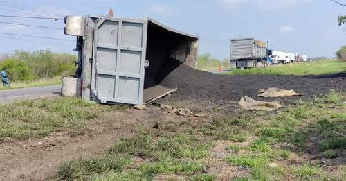 CD. VICTORIA, TAMAULIPAS, 29 DE MAYO DE 2022.- Varias toneladas de material asfáltico quedaron regadas a un costado de la carretera después de que el segundo remolque de un tráiler se desprendiera.