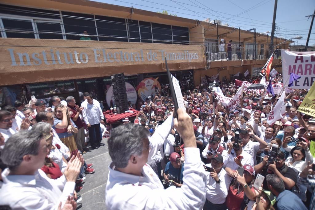 Una vez finalizado el acto protocolario el doctor Américo recibió las muestras de cariño de miles de ciudadanos que lo esperaban en las afueras del IETAM y ante ellos dio lectura a la constancia recibida “el triunfo es de todos, vamos juntos a transformar a Tamaulipas, no les vamos a fallar”, remató, mientras la música sonaba a todo volumen así como los gritos de gobernador, gobernador.