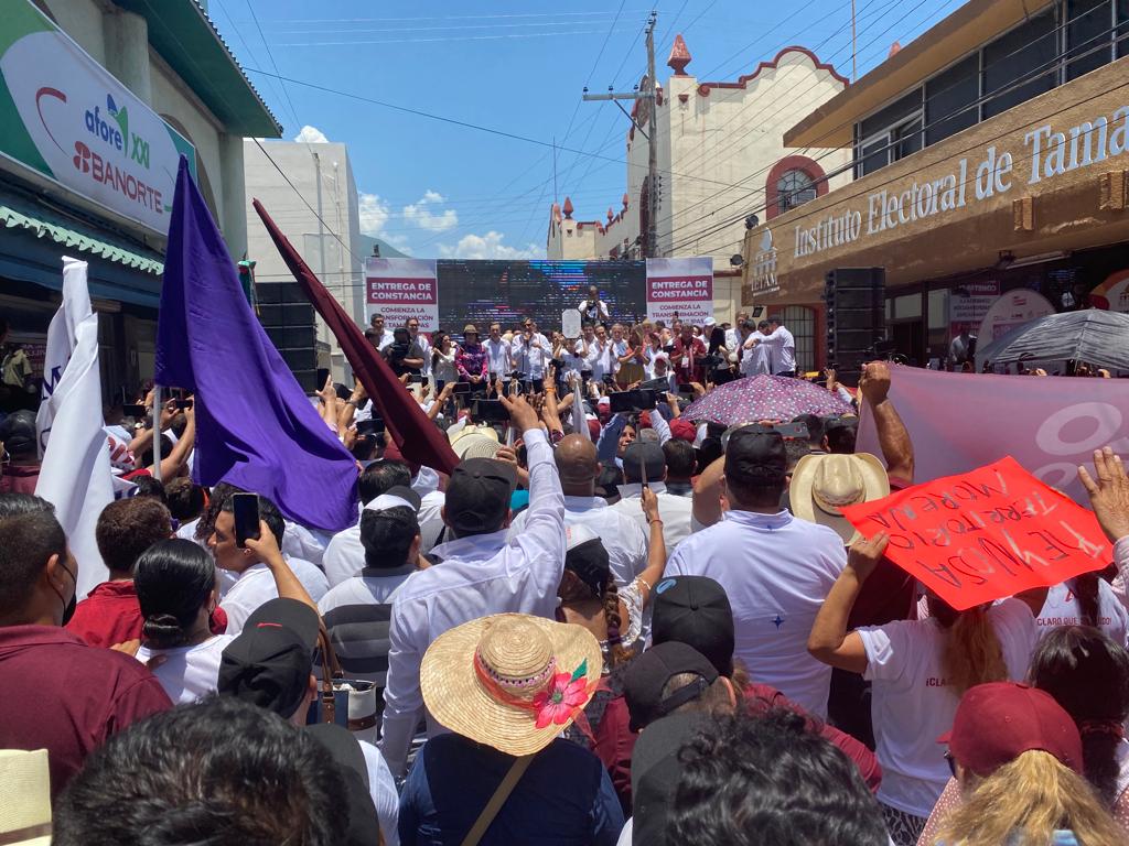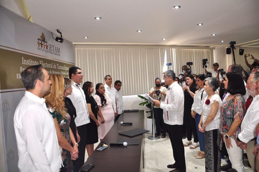 CD. VICTORIA, TAMAULIPAS, 11 DE JUNIO DE 2022.- En el marco de un ambiente de fiesta política en el entorno del Instituto Electoral de Tamaulipas (IETAM), el doctor Américo Villarreal Anaya recibió en el interior de ese organismo en la sesión número 34 del Consejo General la constancia que lo acredita como Gobernador Constitucional de Tamaulipas para el periodo 2022-2028 tras obtener 731 mil 383 votos, lo que representa el 51.54 % de los sufragios emitidos en la jornada del 5 de junio.
