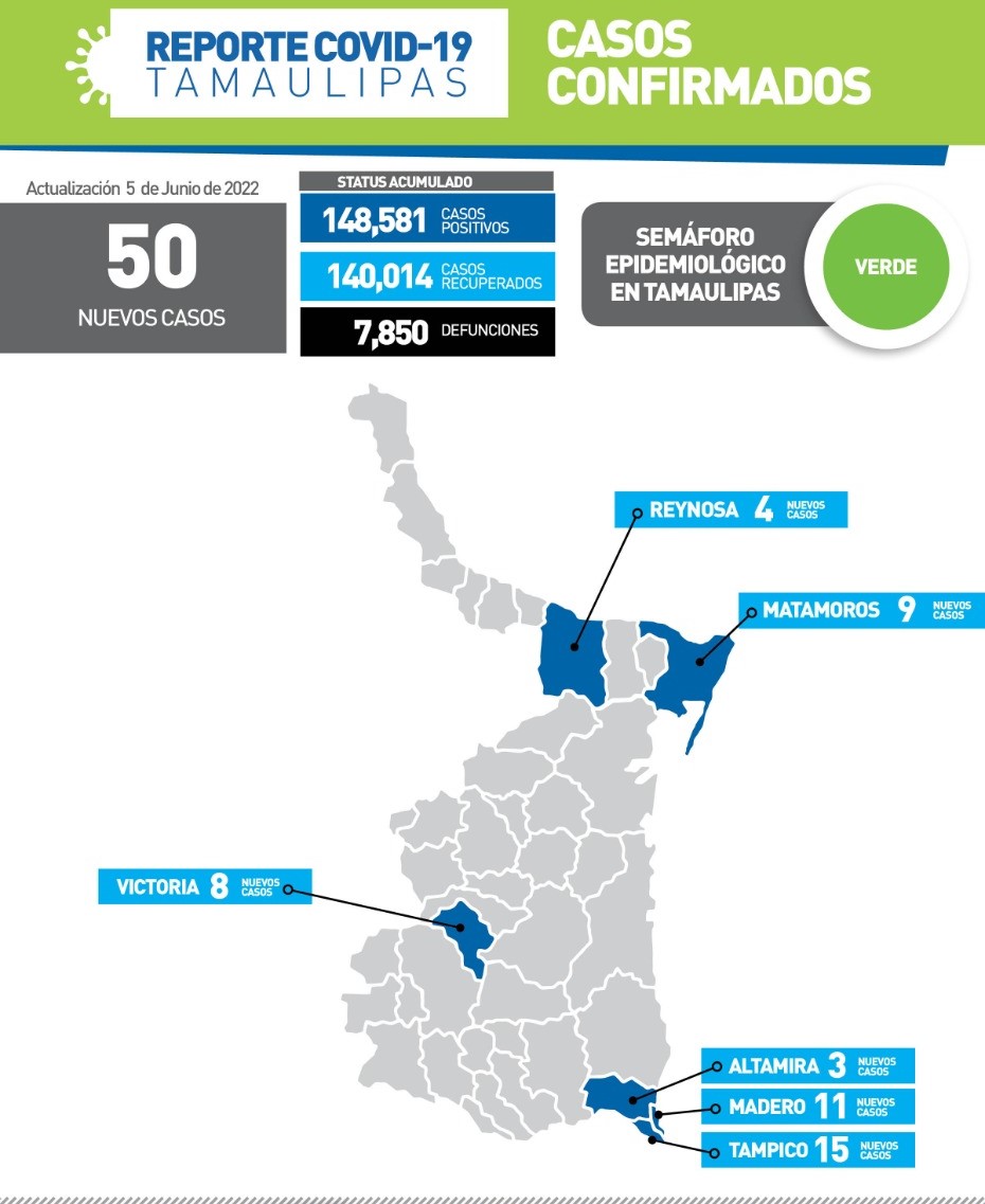 Reportan hoy 50 nuevos contagios de Covid en 6 municipios de Tamaulipas