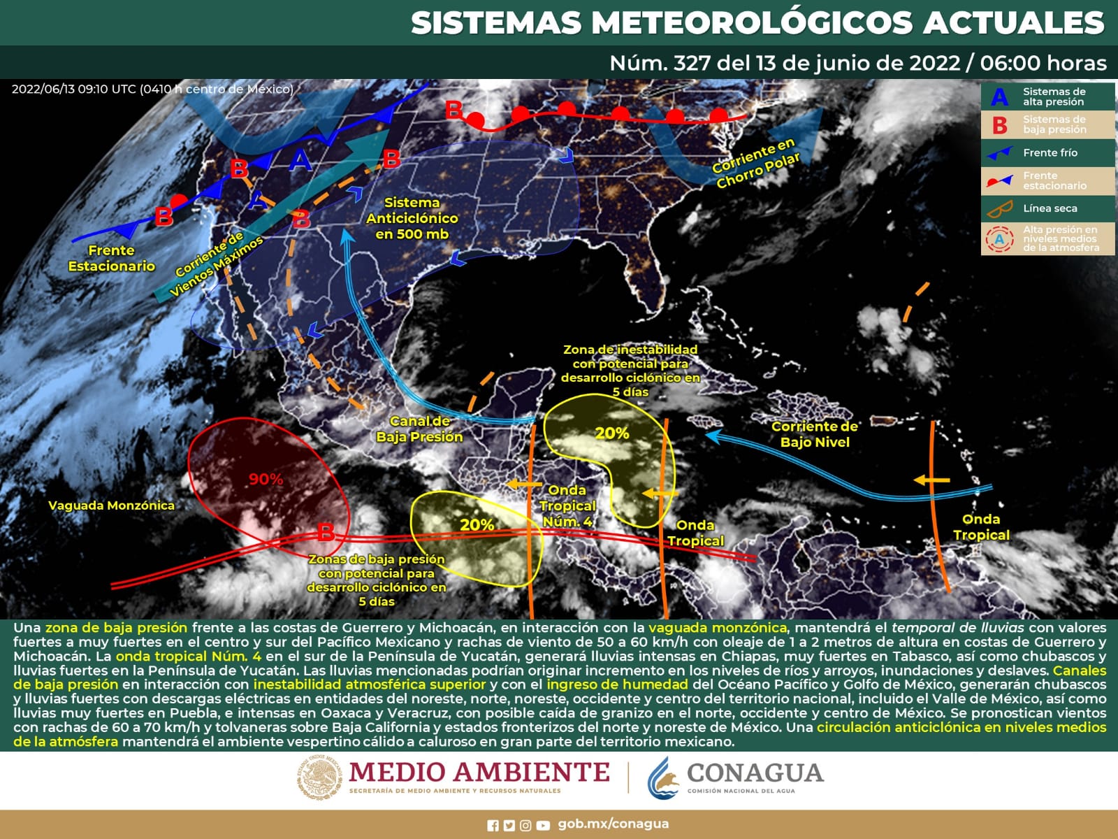 En su pronóstico para este día, el Servicio Meteorológico Nacional informó sobre el avance de la onda tropical número cuatro sobre el sur de la Península de Yucatán y el Golfo de Tehuantepec.
