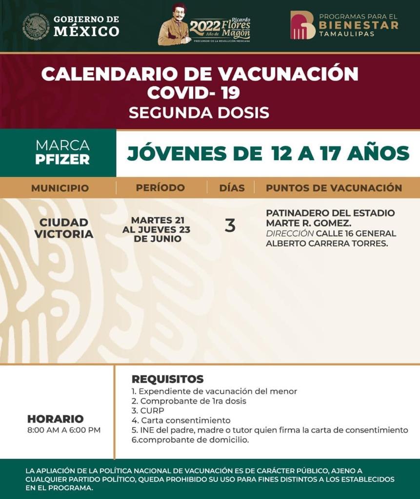 CD. VICTORIA, TAMAULIPAS, 18 DE JUNIO DE 2022.- La Delegación Federal de la Secretaría de Bienestar, dio a conocer que del próximo martes 21 al jueves 23 de junio se realizará la jornada de vacunación para inmunizar contra el Covid-19 a jóvenes de 12 a 17 años.