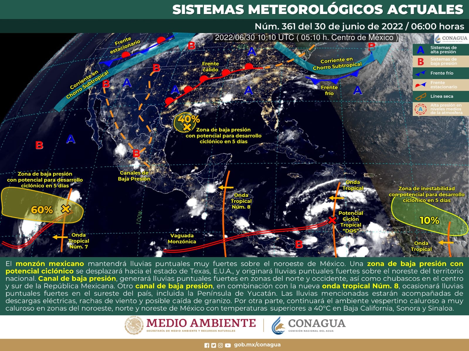 Ciudad Victoria, Tamaulipas (30 de junio de 2022).- La zona de baja presión ubicada al norte del Golfo de México mantiene un 40 por ciento de probabilidad para desarrollar un ciclón tropical en el pronóstico a 48 horas.