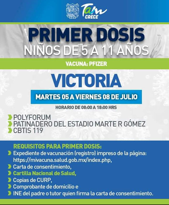 Ciudad Victoria Tamaulipas, 5 de julio del 2022.- El día de hoy arranca oficialmente en Ciudad Victoria mega jornada de vacunación anticovid a niños de 5 a 11 años de edad, la vacuna que se estará aplicando será de la farmacéutica Pfizer.