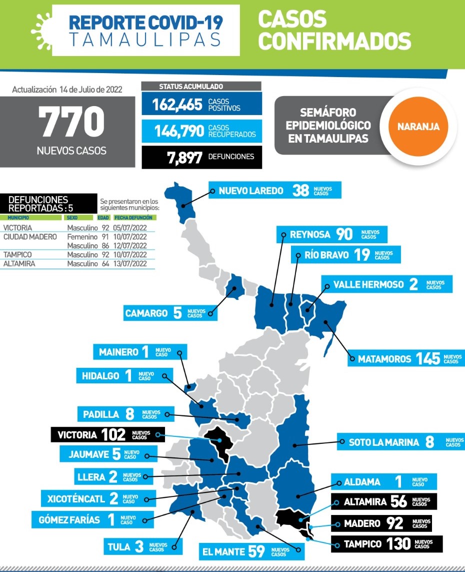 De los 770 nuevos contagios los municipios más afectados fueron Matamoros con 145, Tampico 130, Victoria 102, Ciudad Madero 92, Reynosa 90, El Mante 59,  Altamira 56, Nuevo Laredo 38 y Río Bravo 19, entre otros.